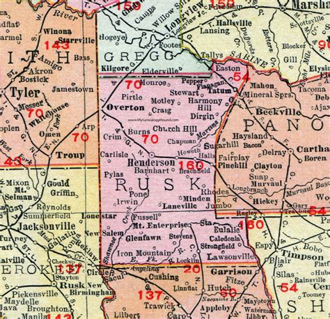Rusk County, Texas, 1911, Map, Rand McNally, Henderson, Tatum, Mt from www.mygenealogyhound.com
